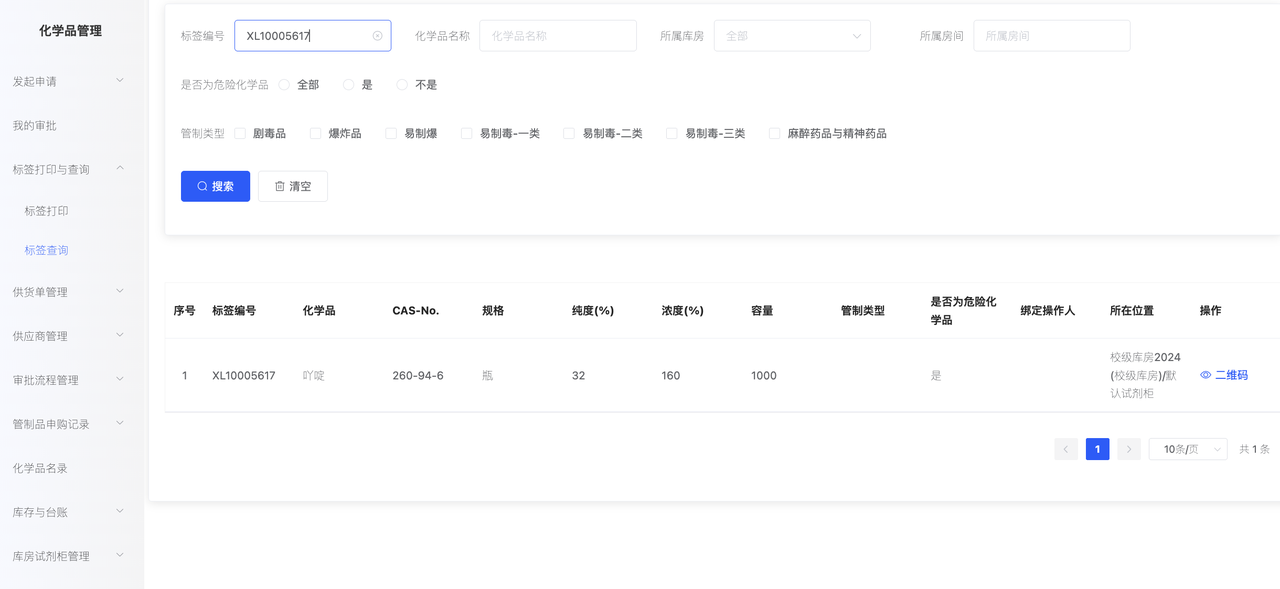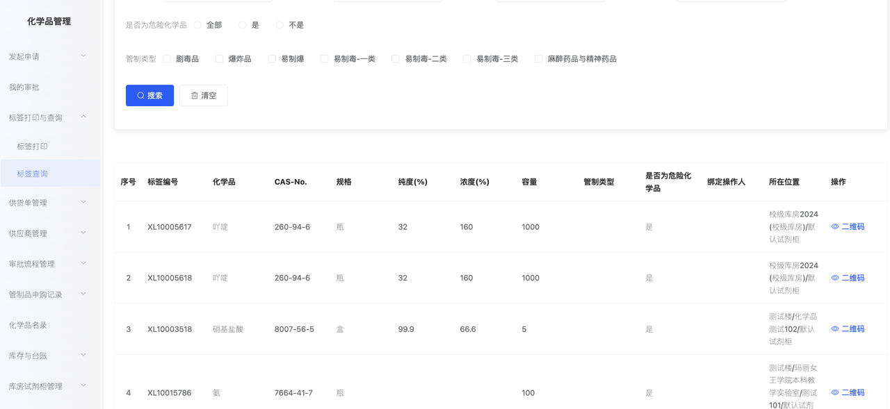 选择“化学品管理”-“标签打印与查询”-“标签查询”,在这里可以查看所有历史标签。