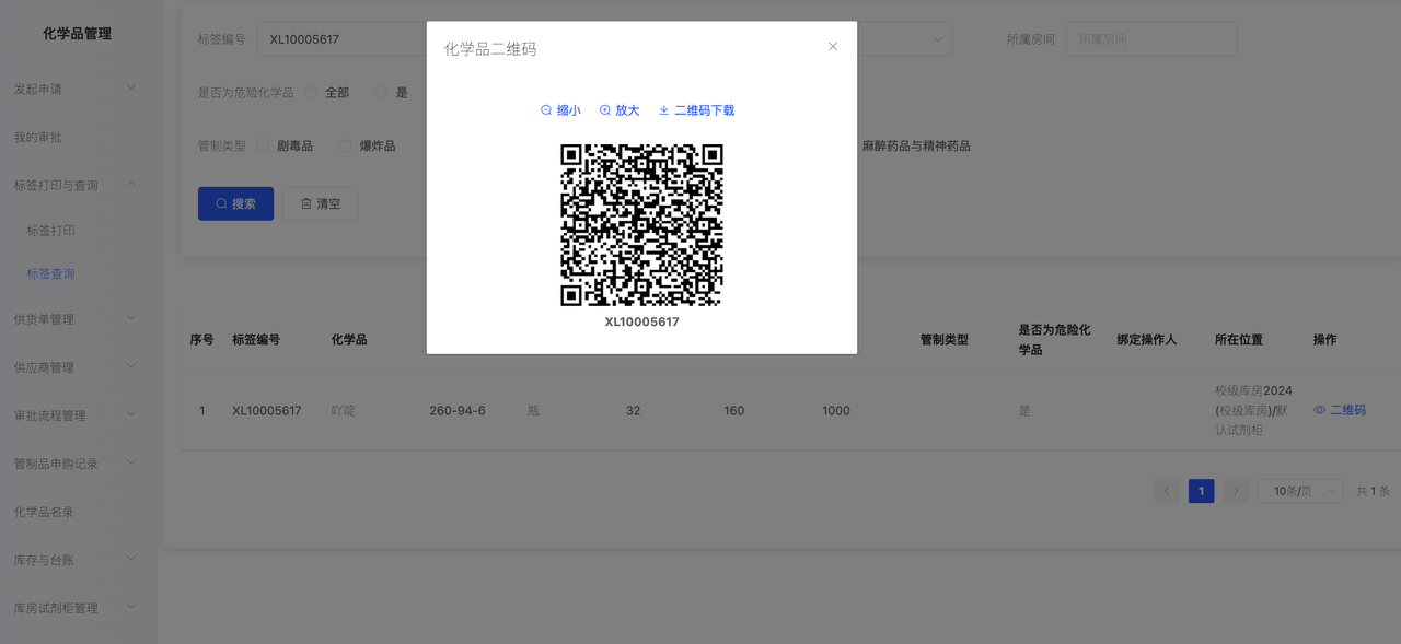 在查询到的标签记录最右侧,点击“二维码”,会弹出该标签对应二维码,重新下载打印,粘贴回试剂瓶即可。
