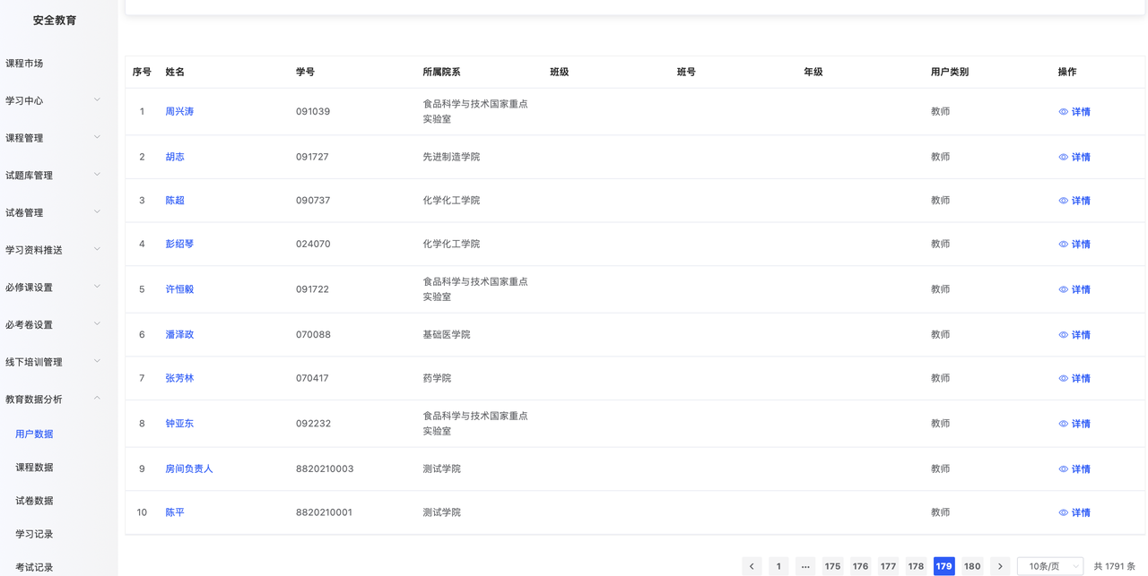 选择一名用户,点击其记录最右侧的“详情”,就可以查看这名用户详细的学习情况。