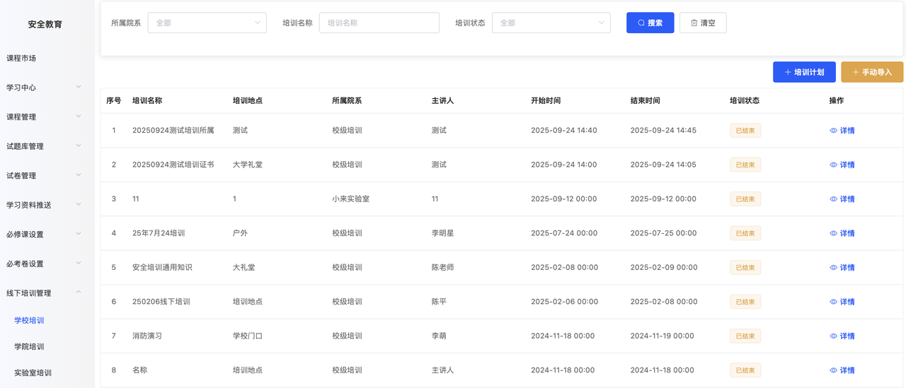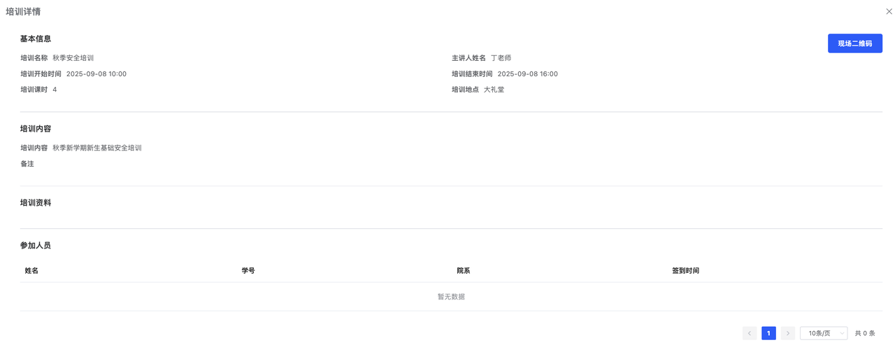 选择“安全教育”-“线下培训管理”,这里可以看到线下培训的记录。校级管理员可以看到全校范围内组织的线下培训记录,学院级管理员可以看到学院范围内组织线下培训记录,实验室管理员可以看到所负责实验室组织的线下培训记录。