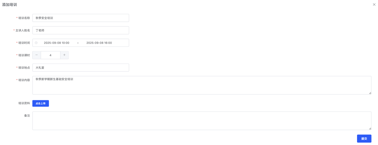 填写完培训的具体内容后,点击“提交”,将生成本次活动记录。