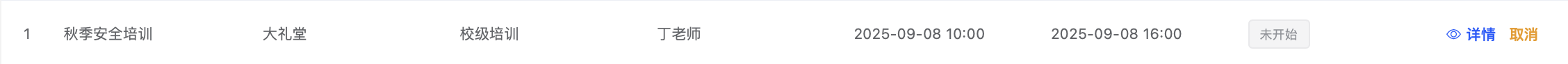 选择“安全教育”-“线下培训活动”, 在页面里找到相应的活动,点击记录最右侧的详情,就可以看到相关信息。