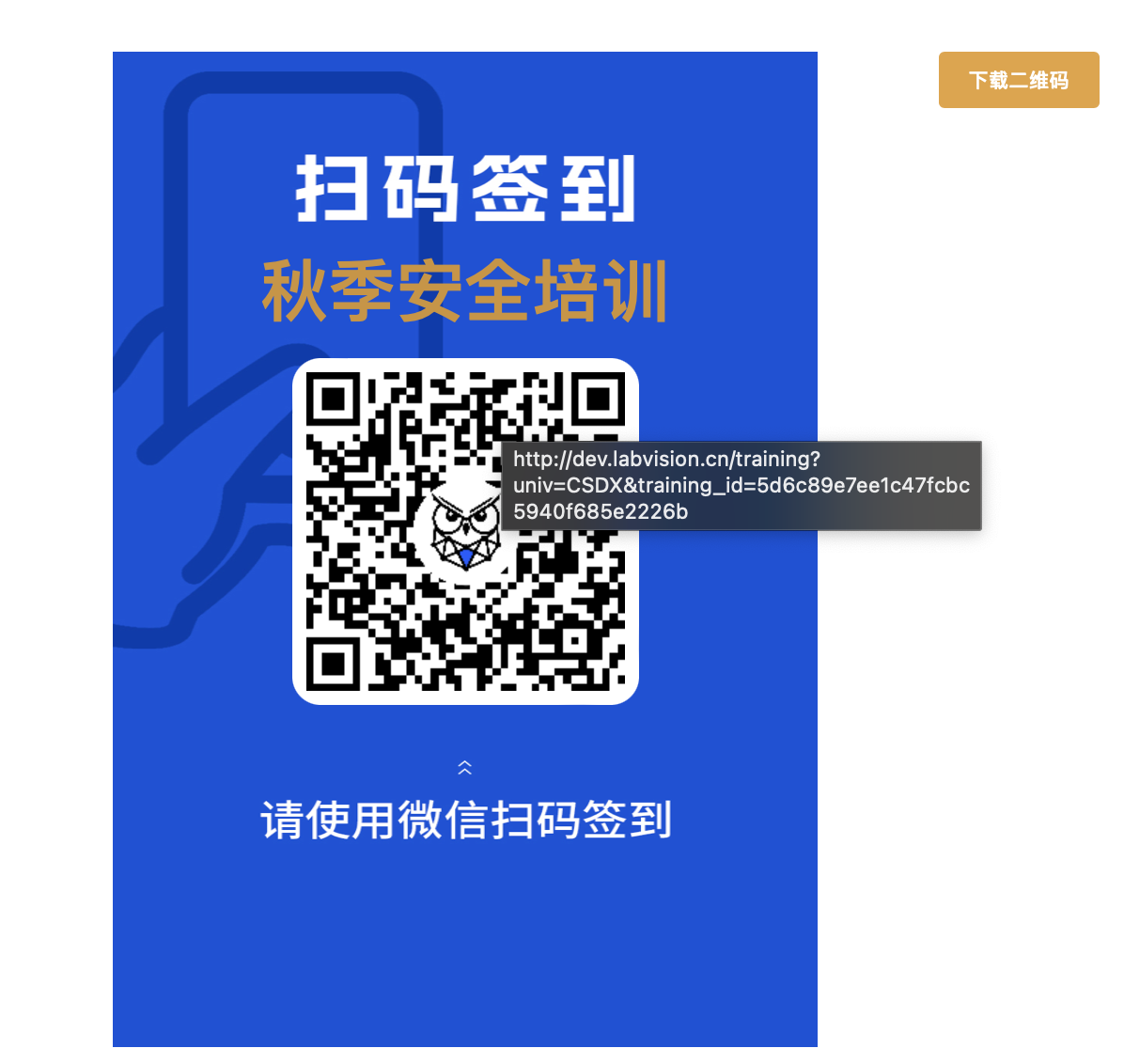 点击右上角的”现场二维码“,会得到这次活动专属的发布二维码,可以用来现场签到。