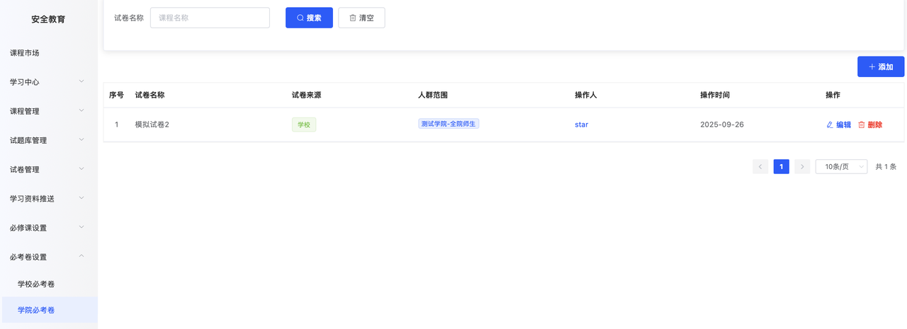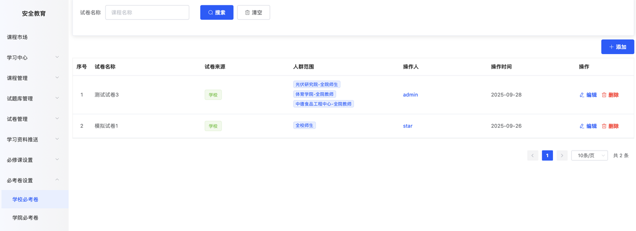 可以看到当前已经设置的必考卷。 如需新增,点击右上角的“+添加”。 添加页面允许进一步细分参加考试的人群范围,如全体师生|学生|教师。