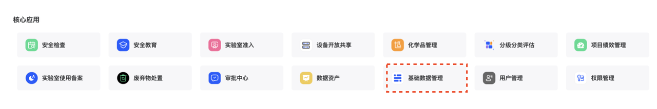 在工作台的“核心应用”板块中点击“基础数据管理”应用,进入之后,可以看到子菜单内包含对校区、楼宇、实验室等各级子类信息配置。