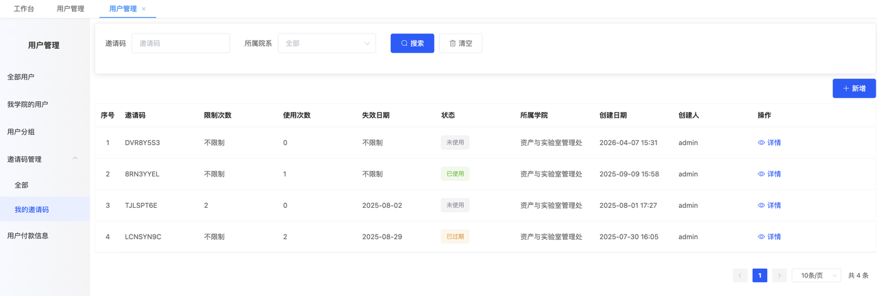 2)点击右上角的“+新增”,来创建一个新的邀请码。