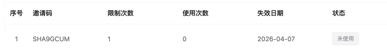 3)创建之后,可以在 邀请码页面中看到新生成的邀请码,将其发给用户使用。